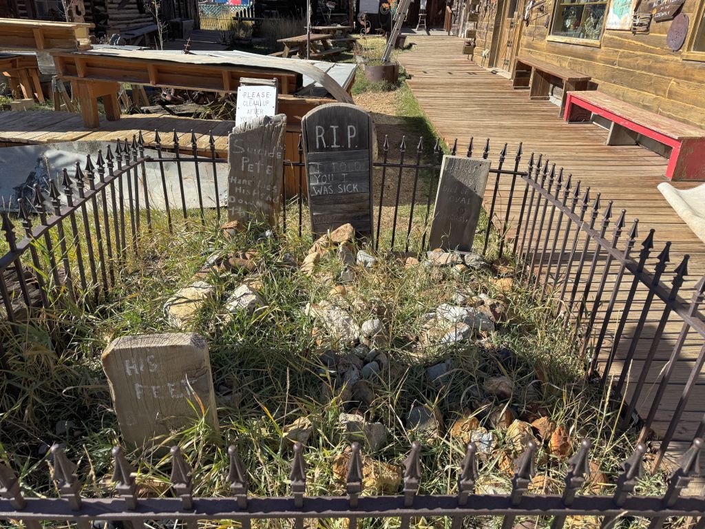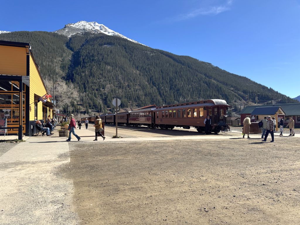 In Silverton war die Durango-Silverton-Schmalspurlok bereits im Bahnhof eingefahren – es war 13:30 Uhr, als wir ankamen. In etwas über einer Stunde wird sie wieder zurückfahren. Wir liefen eine kleine Runde, aber da wir hungrig waren, gab es heute einen Burger hier im Restaurant. Es war noch relativ viel los, aber wir fanden einen Platz – die meisten Bahnfahrenden hatten sicher schon ihr Mittagessen. Bis unsere Bestellung aufgerufen wurde, dauerte es trotzdem noch einen Moment. Wir aßen draußen unter einem kleinen Zelt – die Sonne war so stark, dass es zu warm wurde, obwohl die Umgebungstemperatur keine 10 °C betrug.