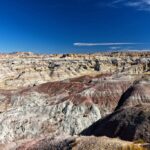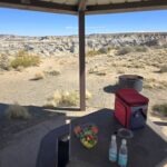 Der Weg führte vom immer noch vierspurigen Highway auf eine unbefestigte Straße. Es roch deutlich nach Öl. Es gab einen kleinen „Hof“ mit diversen Baumaschinen – ich googelte den Namen der ausgeschilderten Firma – die restaurieren Land von Kontaminationen, hier offensichtlich von einem Ölfeld. Der Aussichtspunkt befand sich nicht weit vom Highway entfernt. Wir machten ein paar Fotos und schauten uns an, womit wir es morgen in den Bisti Badlands zu tun bekommen. Ganz klar: Wir müssen nach dem Frühstück zeitig los – in der Mittagssonne sieht das nicht besonders schön aus. Das Licht ist ziemlich hart und wirft keine Schatten.