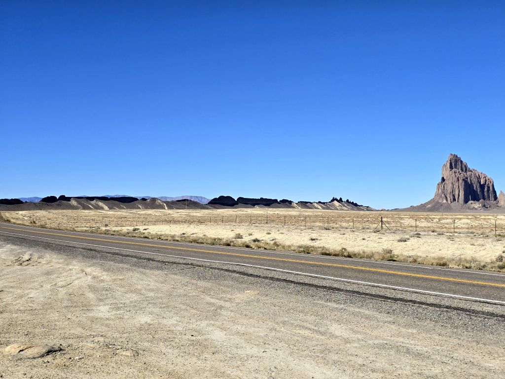 Jetzt noch tanken und los ging es. Erstaunt erblickte ich am westlichen Ortsrand den großen Felsbrocken, der wohl eher ein Vulkanrest ist und Shiprock genannt wird. Ich hatte keine Ahnung, wie riesig der ist.