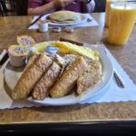 Mein French Toast mit zwei Scheiben Toast war riesig. Die Scheibe war knapp 4 cm dick. Das hatte ich nicht erwartet. Dazu gab es Rührei, Wurst, Butter und Sirup, wenn man das mochte.