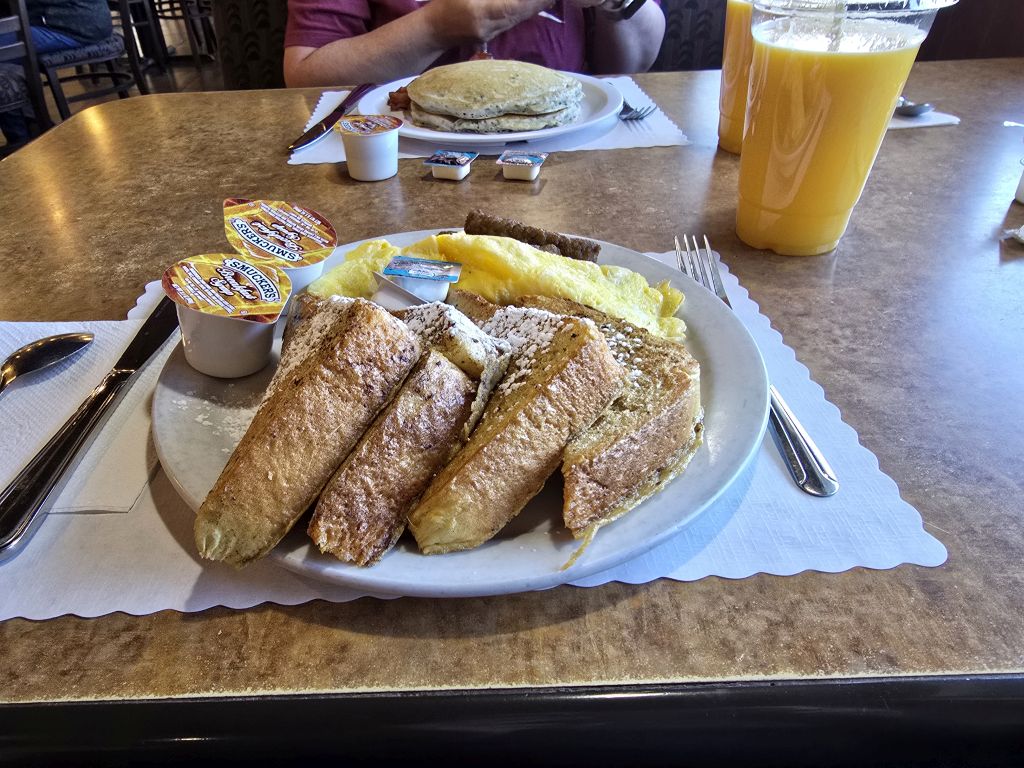Mein French Toast mit zwei Scheiben Toast war riesig. Die Scheibe war knapp 4 cm dick. Das hatte ich nicht erwartet. Dazu gab es Rührei, Wurst, Butter und Sirup, wenn man das mochte.