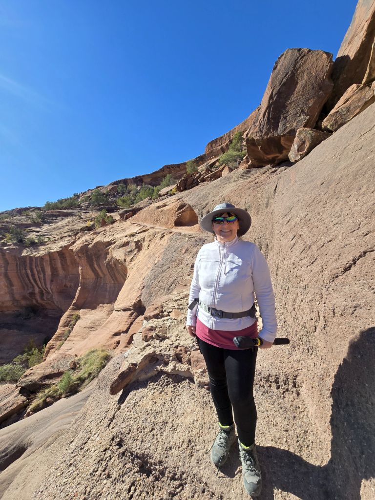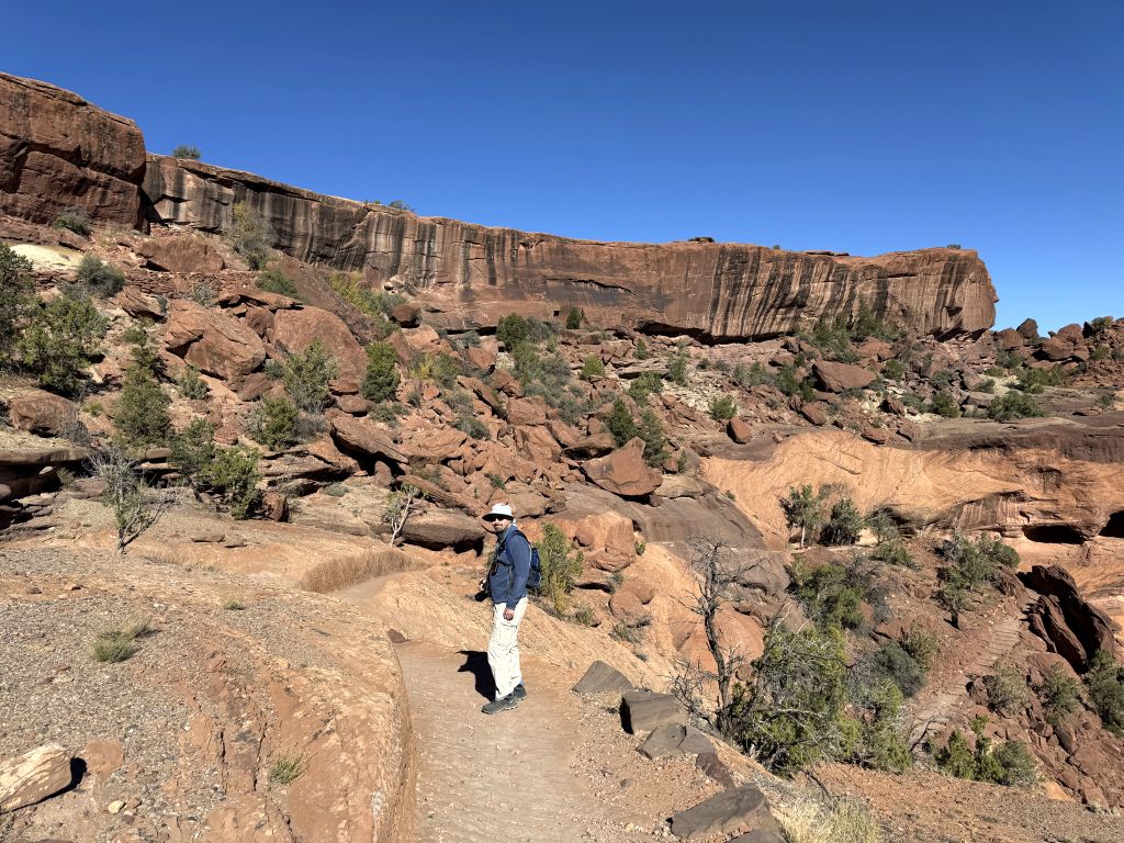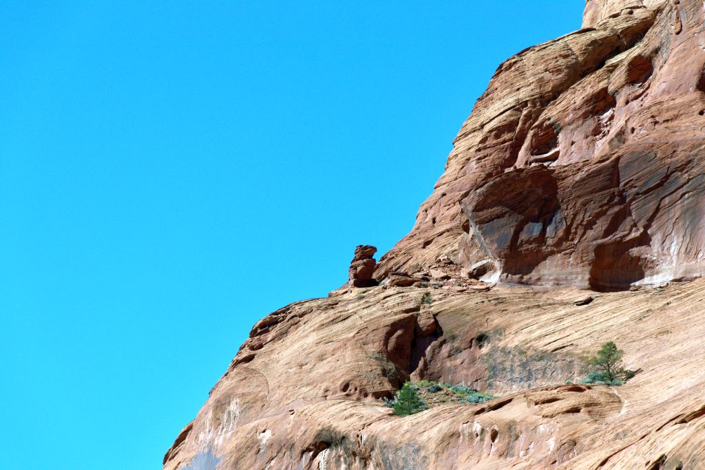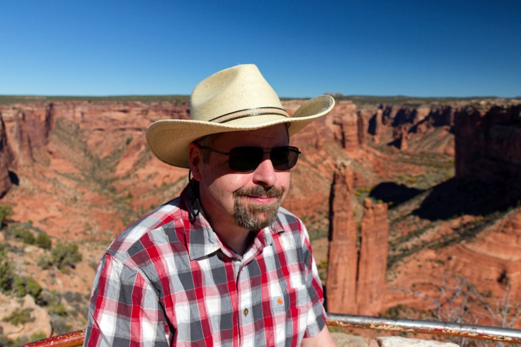 Der letzte war der berühmte Spider Rock hier. Auch wenn die Sonne ganz hoch stand, sollten die Fotos etwas geworden sein. Ich zog für Fotos wieder den Stetson und das Hemd an. Grit durfte dann in verschiedenen Einstellungen wieder Bilder mit der großen Kamera schießen – irgendwas Passendes wird sicher draus geworden sein.