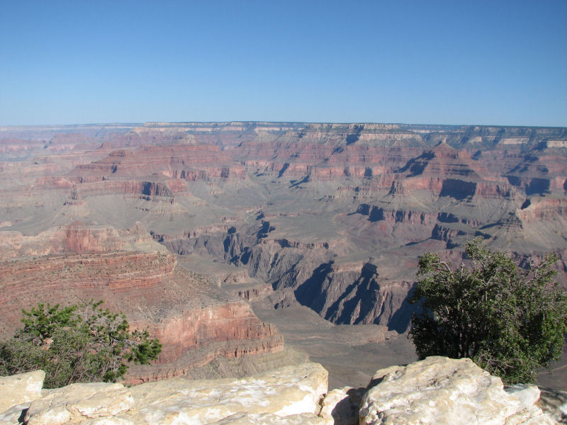 Für heute erwartete ich nun endlich den interessanten Teil des Urlaubs. In Williams hieß es gegen 4 Uhr: Aufstehen! Nach Frühstück und Checkout sind wir dann aber doch erst 6 Uhr losgefahren. Die Fahrt zum Grand Canyon war um die Uhrzeit aber ruhig, bei einer schönen Landschaft. Den Sonnenaufgang erlebten wir halt auf dem Highway. So eine Morgensonne kann beim Autofahren ziemlich unangenehm sein! Gegen 7 Uhr kamen wir im Nationalpark an. Diese Uhrzeit erwies sich als genau richtig – im Park war es noch ziemlich leer und die Sicht besserte sich im Laufe des Morgens erst richtig. Eher hätte es uns gar nichts gebracht. Die Eindrücke waren unbeschreiblich, sowas muss man gesehen haben – eine unfassbare Weite zeigte sich uns. Die Sichtweite betrug gegen 10 Uhr 85km!